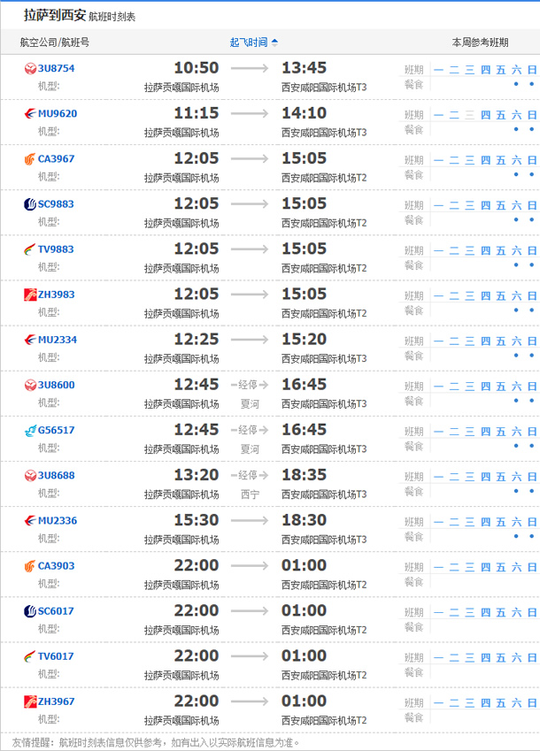 以上就是拉薩飛西安的航班時刻表,起飛時間,到達時間,及固定航班日期。